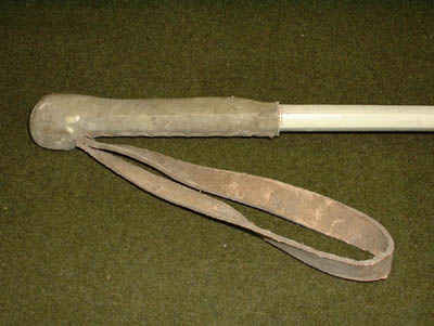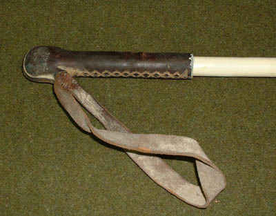 Ski pole leather handle of alternative manufacture, with leather strap to support the hand when polling. The shaft is made of wood with a circular cross-section.
