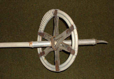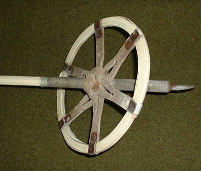 Ski pole basket and pick. The basket is laminated wood with leather support straps.