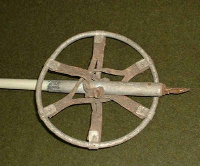 Ski pole basket and pick. The basket is aluminum with leather support straps.