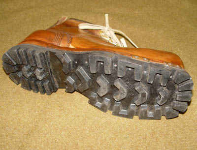 Ski, ski boot and binding system used by the 10th. The skis were typically laminated hickory with segmented steel edges. The bindings were of the nonreleasable design (bear trap) and could be set up for downhill skiing with the heel secured to the ski with a cable. With a change in cable location from the rear to the side of the toe piece, the binding converted to a cross-country type binding where the heal would lift during the stride. The boots had a square toe and heel grooves to accept the securing cable. The boot was only ankle high, giving relatively little support for edging purposes; typical of the boot technology of the period.