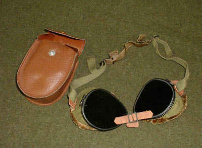 Goggles: ski-mountain, with polished glass lenses, green tinted for UV, infrared and glare protection