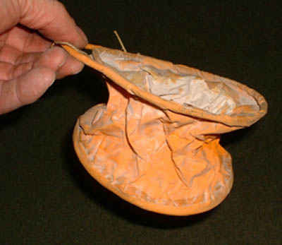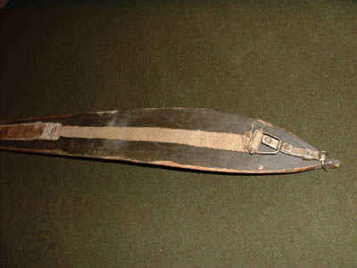 View of seal skin straps used to cross-country ski uphill. The seal skins were strapped onto the bottom of the ski, increasing friction so that the ski trooper could traverse up a hill without sliding backward. These were issued to the 10th, but several members were expert skiers and had their own. The one shown is of civilian origin.
