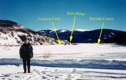 Camp Hale looking south with the author on the left, November 2002. The arrows point to where the exercise file, rifle range and bayonet course were located.