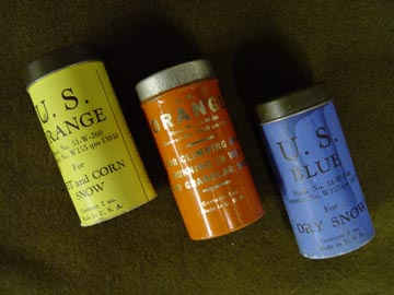 Orange ski wax for wet and granular snow, blue for dry snow and yellow for wet or corn snow, manufactured by F. H. Wiessner, Inc.