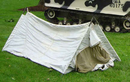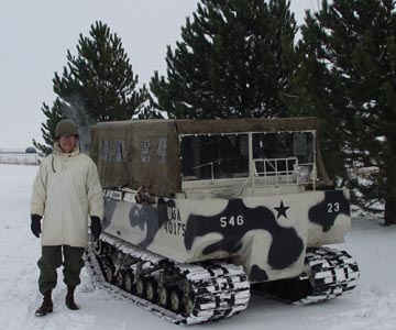 The photo above, left shows the snow camouflage shell, skis, poles and M1 "Garand" 30 cal. rifle. The vehicle is an M29C troop carrier nicknamed the "Weasel" made by Studebaker Corporation, one of the first snowmobiles. The canvas top encloses the occupant compartment which is heated. The tracks are very wide allowing the vehicle to operate on light snow.