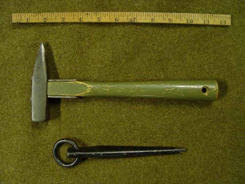 Piton, mountain, type V, soft iron spike for mountain climbing and hammer.