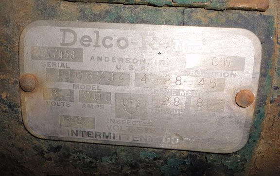 Figure 7 is a label on the starter showing a date of manufacture of 4-28-45. The starter appeared to be the original starter. Figure 8 is a drawing of the 1952 pattern. The winch was external to the hull and there were no machine gun pits on the 1952 pattern, suggesting that this boat is indeed a WWII boat, probably produced near the end of the war. The manufacturer of the boat could not be determined because of the lack of a hull number.