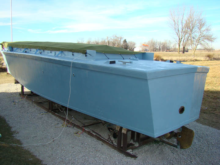 Figure 8B Drawing of a WWII boat. The ramp winch is inside the hull and two gun pits are provided near the stern. (Courtesy National WWII Museum)