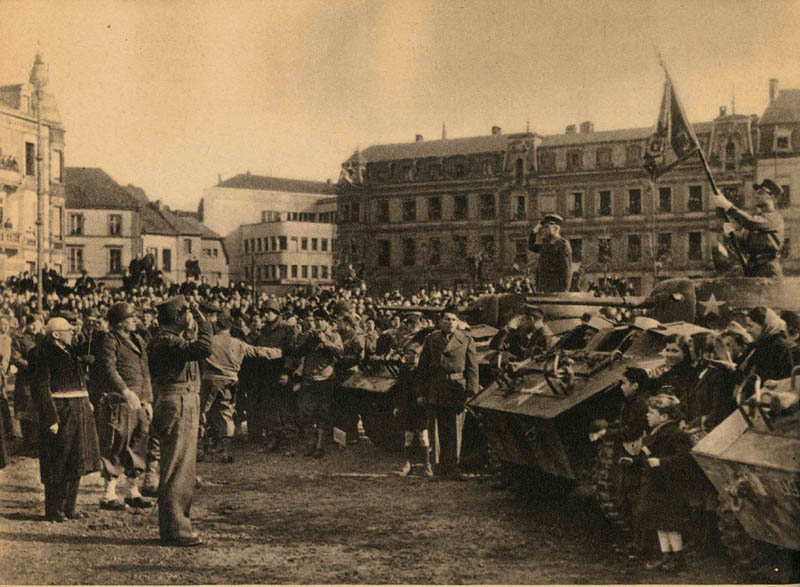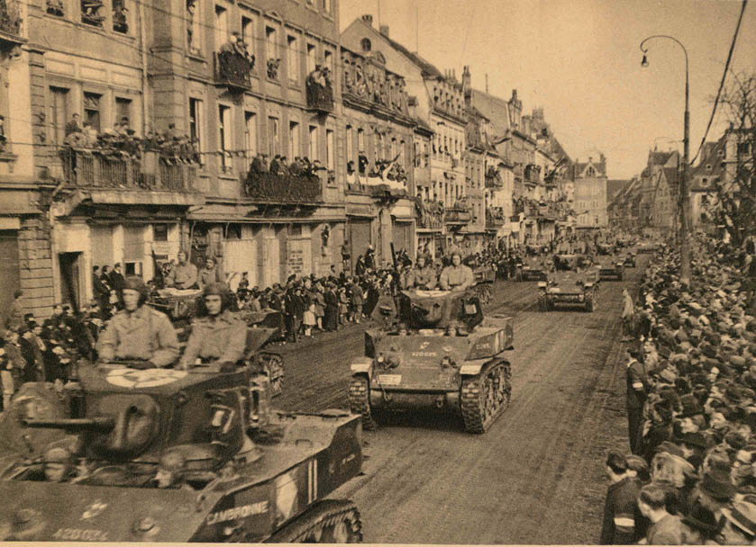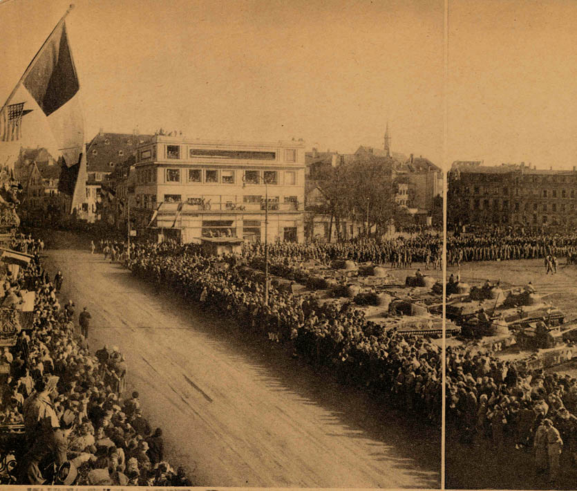 Photo 16 is a view of a victory ceremony in February, 1945 looking down the Avenue de la Republique in Colmar. Photo 17 is a similar view taken in 2010.