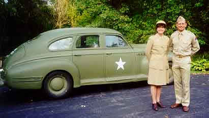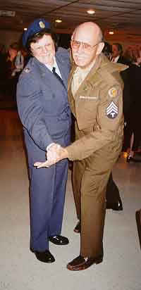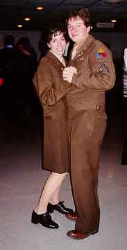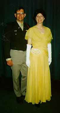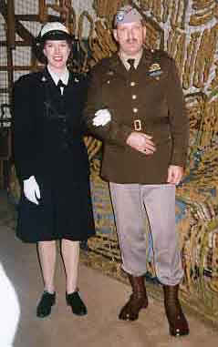 Dennis in enlisted brown class A uniform withtech sergeant rank. Ellen in 1940's dinner dress.