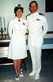 Chuck in Navy formal dinner dress blue with Lt. Cmdr. rank. Lydia in WAVES