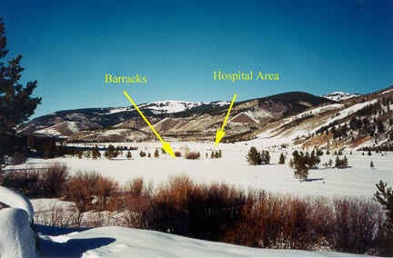 Camp Hale, the living and training area of the 10th Mountain Division in WWII, looking north in November, 2002. All buildings have been removed with only the foundations remaining. The arrows point to where the barrack areas and the hospital were located.