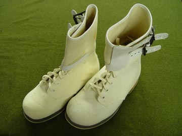 Ski, ski boot and binding system used by the 10th. The skis were typically laminated hickory with segmented steel edges. The bindings were of the nonreleasable design (bear trap) and could be set up for downhill skiing with the heel secured to the ski with a cable. With a change in cable location from the rear to the side of the toe piece, the binding converted to a cross-country type binding where the heal would lift during the stride. The boots had a square toe and heel grooves to accept the securing cable. The boot was only ankle high, giving relatively little support for edging purposes; typical of the boot technology of the period.