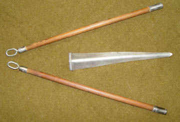 Ski pole basket and pick. The basket is laminated wood with leather support straps.