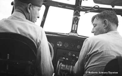 Shown below is Lt. Taynton on the right and the instructor pilot on the left. They are most likely reviewing the aircraft controls and gauges associated with flying the aircraft. Notice the engine throttle handles between the two used to adjust engine speed. (Taynton photo) |
