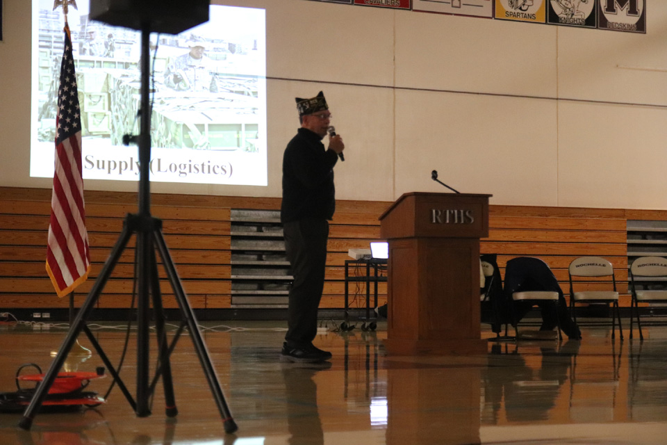 Post 403 Commander gives Veterans Day Speech to the Assembly at Rochelle Township High School
