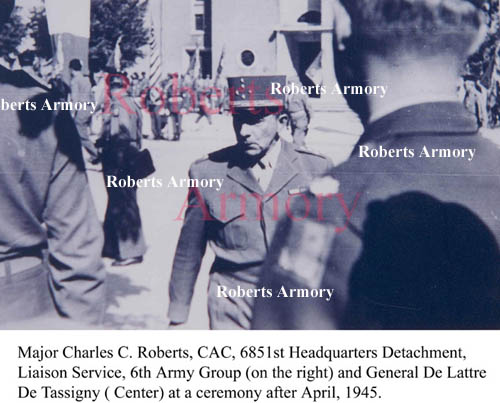 Photo 14 shows General De Lattre de Tassigny in the center with Major Roberts to the right. This is probably after an award ceremony at the end of June, 1945. According to 6th Army Group general order 51, the Bronze Star was awarded to