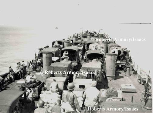 Heading toward Utah Beach on an LST (Photo 4): this is probably service company of the 70th Tank Battalion, which arrived at Utah Beach on approximately June 15, 1944. The LST is loaded with ammunition and fuel trucks.
