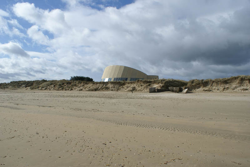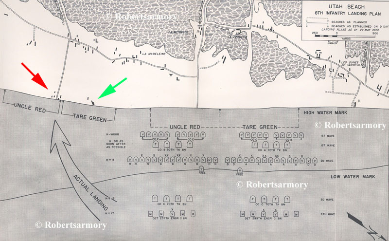 Landing plan at Utah Beach (Photo 5). The red arrow points to one of the beach exits, exit 2. The green arrow points to a privately owned villa that is often seen in photos of the beach landing.