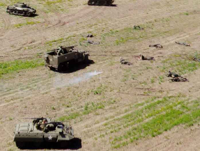 Overall view of battlefield and spectators showing armor and infantry assault, as seen from the L3 observation plane