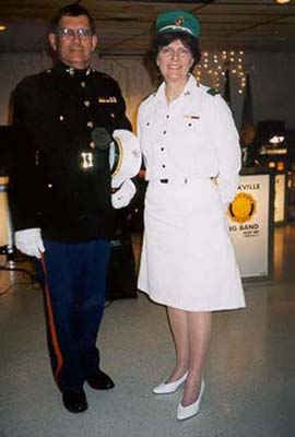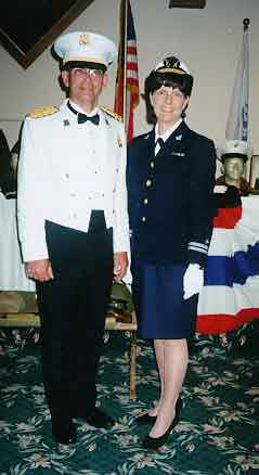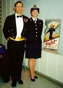 Chuck in Navy formal dinner dress blue with Lt. Cmdr. rank. Lydia in WAVES