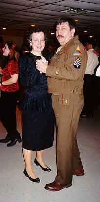 Dennis in enlisted brown class A uniform withtech sergeant rank. Ellen in 1940's dinner dress.