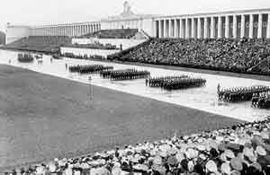 Shown below and to the left is a view of the Zeppelin grandstand at Soldiers' field in 1939, the site of