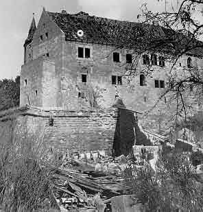 Looking north from the center of Nuremberg toward the imperial fortress, 1945 and in 1998