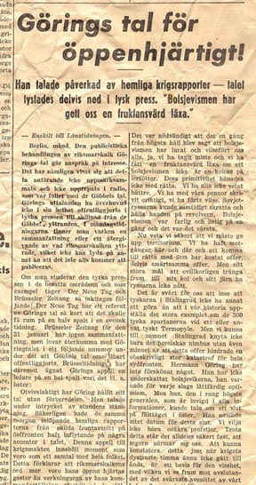 The article in Figure 6 is entitled “Goring’s Speech Too Open-hearted.” This suggests that this Swedish writer was not totally buying everything that Goring had said in a speech. Even in 1943, there was spin.